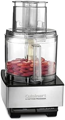 The Cuisinart DFP-14BCNY custom food Processor has an extra-large Feed tube that holds whole fruits and vegetables. Features a 14-Cup work bowl, 4mm stainless steel Medium slicing disc, stainless steel shredding disc, and chopping/mixing blade. Includes a spatula and recipe book.