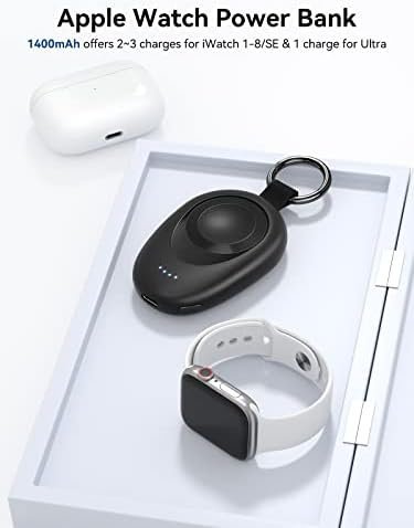 【Portable Charger for Apple Watch】This magnetic wireless charger for Apple Watch equipped with a powerful 1400mAh battery that can provide up to 2-3 full charges for iWatch 1-9/SE and one charge for Ultra/Ultra 2. This portable charger for Apple Watch also features four LED indicators that make it easy to check the battery level at a glance (0–25%–50%–75%–100%).