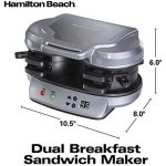 Forget the fast food drive-through. With the Hamilton Beach Breakfast Sandwich Maker, you can enjoy a hot, homemade breakfast sandwich in under 5 minutes. Simply place the ingredients inside, build the base of your sandwich in the bottom layer, place the egg on the cooking plate and close the lid. Slide the cooking plate out and your sandwich assembles itself. Open the lid and your hot breakfast sandwich is ready to eat. The included recipe book provides a variety of breakfast sandwich options, from the traditional egg, ham and cheese to the unique cheddar, apple, bacon and egg croissant sandwich.