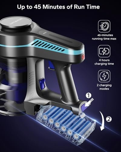 ✅[Upgraded Battery Long Runtime] H18 cordless Stick vacuum has a 2200mAh rechargeable battery, 4H fast charging, delivers up to 20(Max mode)-45(Eco mode) minutes run time depending on your mode, Ideal for whole house work