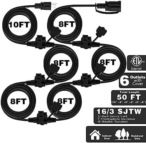 Safety Outlet Covers – The 6 grounded outlets extension cord is rated for use in wet locations. Each outlet plug comes with a safety cover which will protect against rain, snow, and dust.