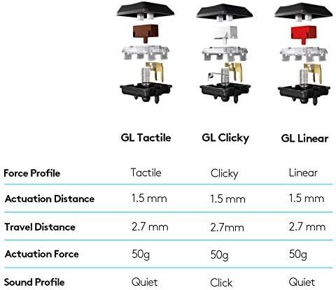 Low Profile mechanical switches offers the speed, accuracy and performance of a mechanical switch at half the height. The GL Linear switch features a completely smooth keystroke through the point of actuation. Comes in 3 options: GL Tactile, GL Linear or GL Clicky.