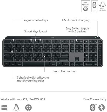 Recycled: Plastic parts in MX Keys S Wireless Keyboard include certified post-consumer recycled plastic — 26% for Graphite and 11% for Pale Grey (5)