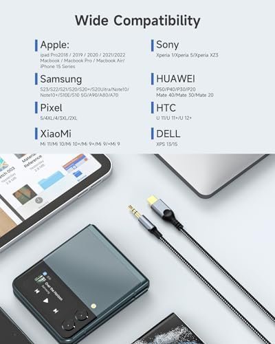 【Relief Strain Design & Wide Compatibility】With the relief strain design, this usb c to 3.5mm male headphone cord can stand 15000+ bending tests, which makes this aux cord much more durable. This USB Type C to audio cable is for most of type c devices. Such as compatible with iPhone 15 Pro Max , 15 Pro , 15 , for iPad Pro 2018, Macbook, Chromebook, Google Pixel 2/3/4 XL, Oneplus 6T 7 7Pro, Samsung S23 S22 S21 S20 Ultra S20 Z Flip S20+ S10 S9 S8 Plus, Note 20 ultra 10 10+ 9 , Huawei, Xiaomi,etc.